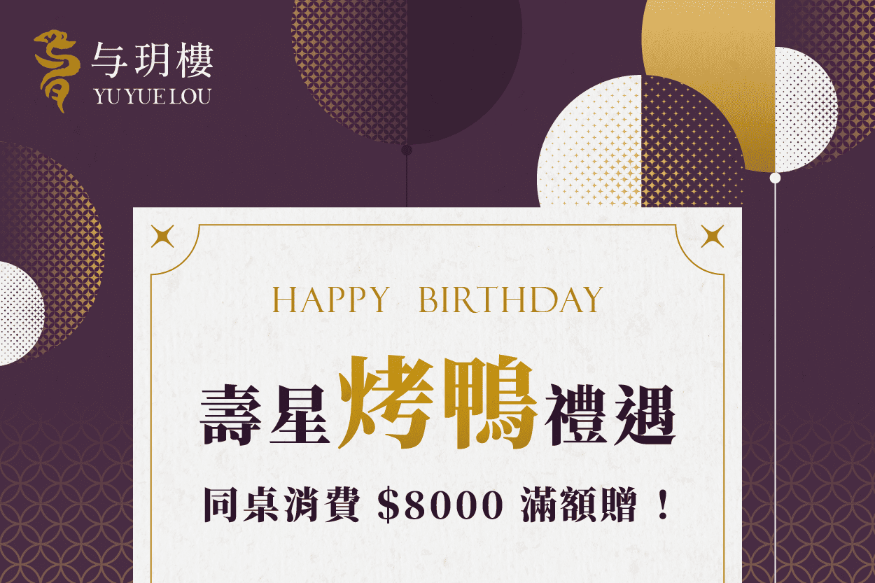 壽星烤鴨禮遇:同桌消費滿$8000,贈烤鴨乙隻。