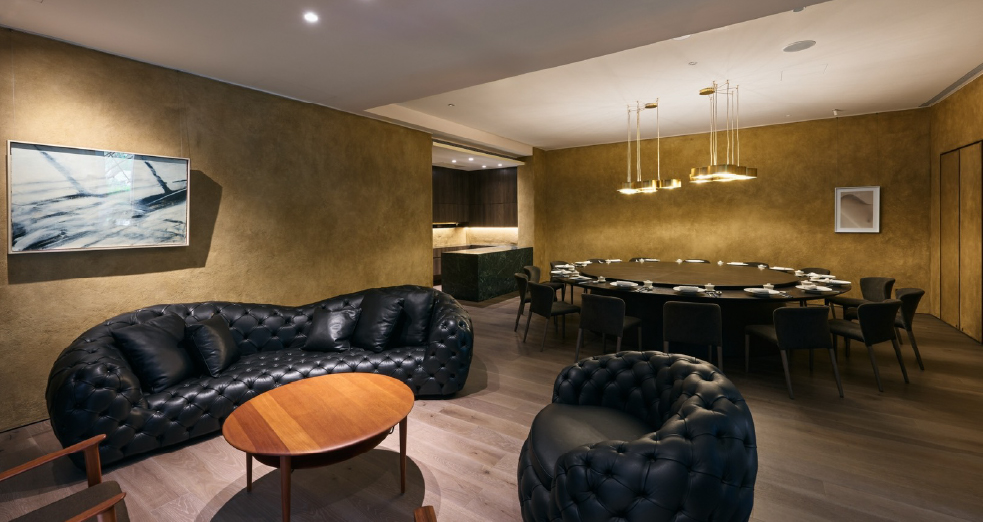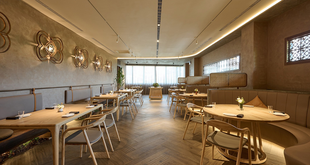 包廂式專屬訂位與空間,以書法與幾何語彙表達山與自然、食物、廚藝共構的理念,讓美好的食材透過淬煉的廚藝發光發熱。